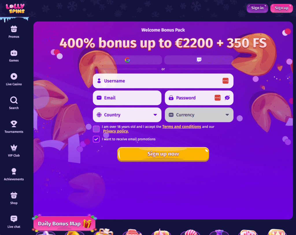 Чтобы получить регистрационный бонус Lollyspins казино, создайте аккаунт, сделайте депозит минимум €25 и активируйте бонус в своём профиле. Все новые пользователи получают до 400% бонусов и 350 бесплатных вращений.