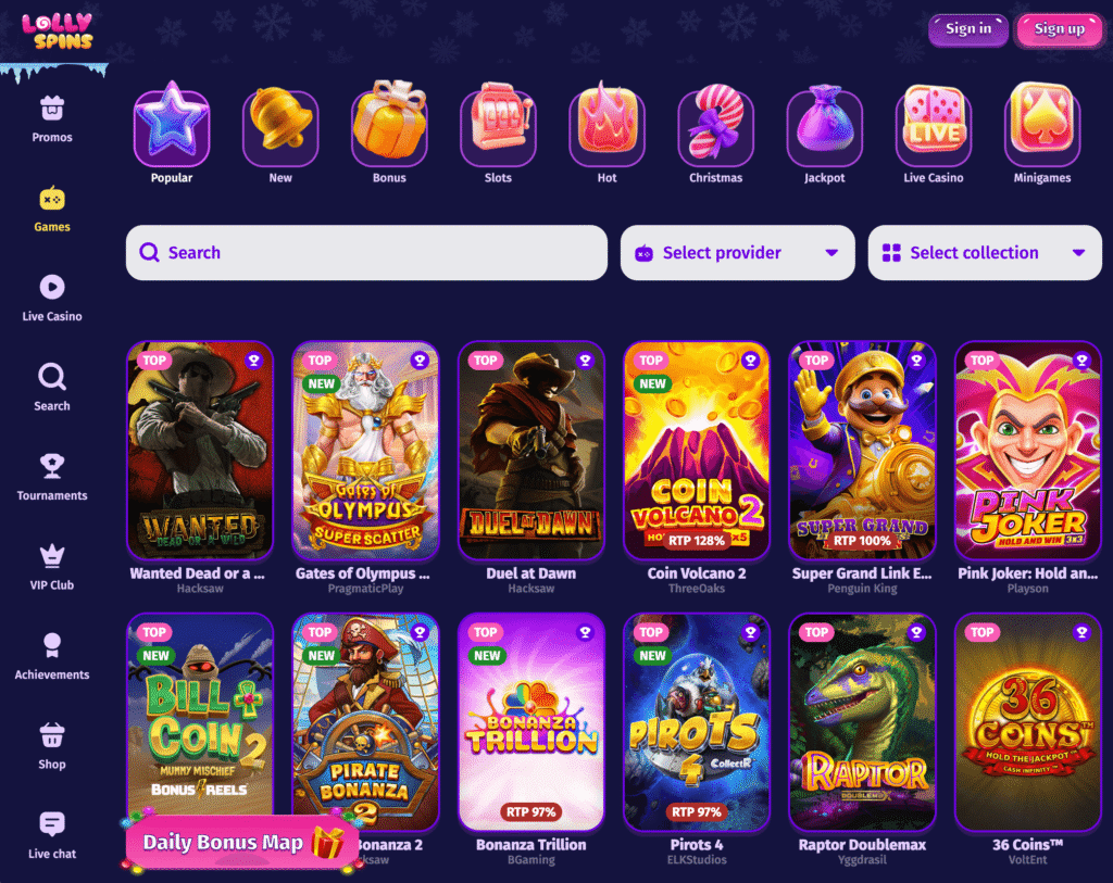 Lollyspins kazino предлагает одну из самых впечатляющих коллекций игр на рынке, и большую часть её составляют игровые автоматы. Всего доступно более 9000 слотов — от классических фруктовых автоматов до современных видеоигр с инновационными механиками и различной тематической графикой. Игровой каталог включает известных разработчиков, таких как Pragmatic Play, NetEnt, Play’n GO и десятки других ведущих студий.